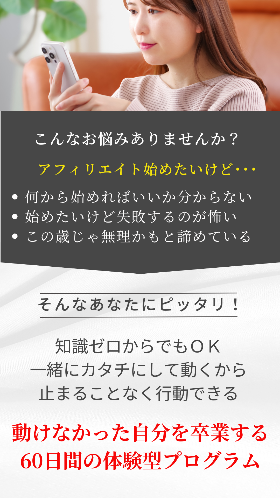 具体的には、広告収益の基本を学ぶ第一歩にもなる「自己アフィリエイト」という、初心者でも確実に成果が出る仕組みを使って、初めての報酬を得るステップを丁寧にサポート。